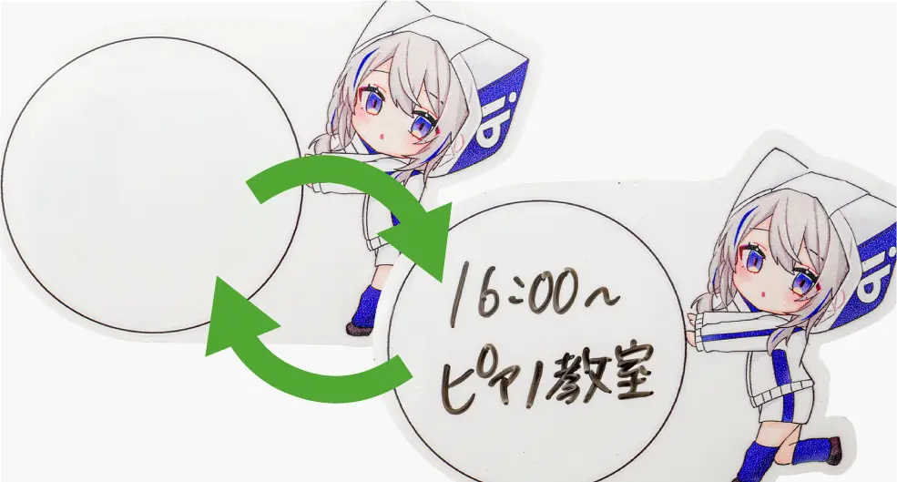 推しのイラストに吹き出しを添えた、書いて消せるホワイトボード仕様のメモアイテム。