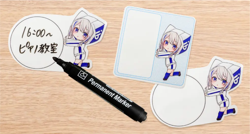 推しのイラストに吹き出しを添えた、書いて消せるホワイトボード仕様のメモアイテム。