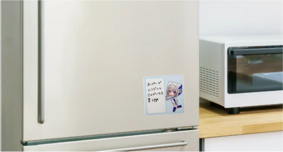冷蔵庫や窓ガラス、鏡などの平滑面に貼り付けられる“自己吸着素材”を採用しており、何度でも貼って剥がせます。